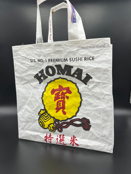 Everything in this collection is up-cycled. All of the rice bags are from a local restaurant in Covington called Kealoha's Kitchen. Additionally this collection contains up-cycled Hawaiian print shirts.